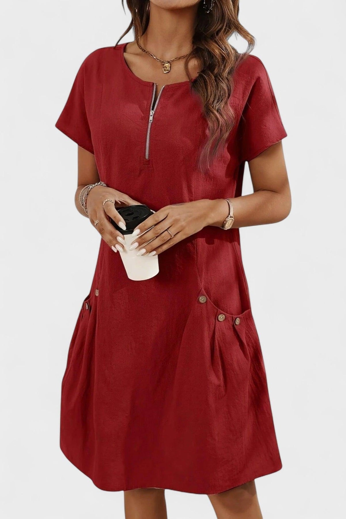 Mette | Lynlås Minikjole forener enkelhed og raffinement i en smuk vinrød farve. Denne kortærmede kjole er designet til at flattere alle kropsformer med sin løse pasform, der sikrer bevægelsesfrihed hele dagen.