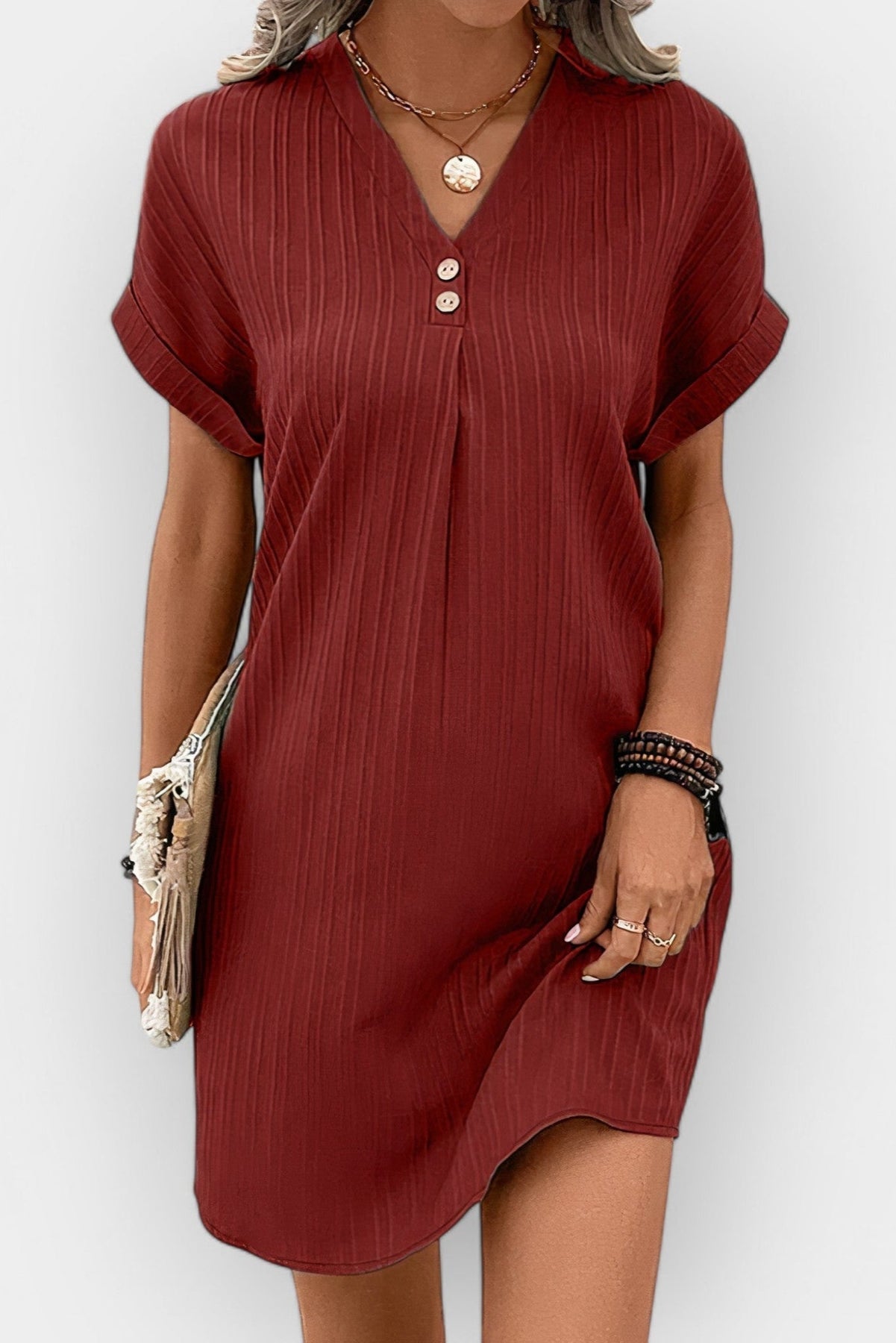 Oplev Rosa: en let sommerkjole, der udstråler rolig luksus og tidløs elegance. Denne kjole kombinerer en feminin V-hals med et afslappet snit, der giver dig fri bevægelse og komfort.