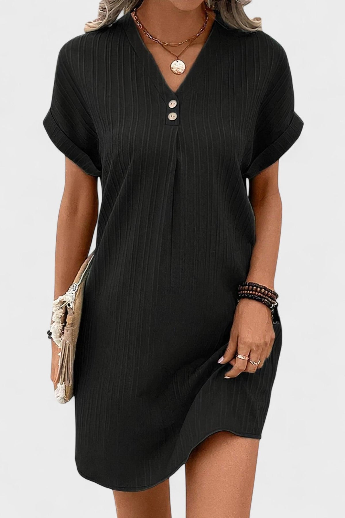 • Elegant V-hals: Fremhæver dekoléten med subtil elegance.