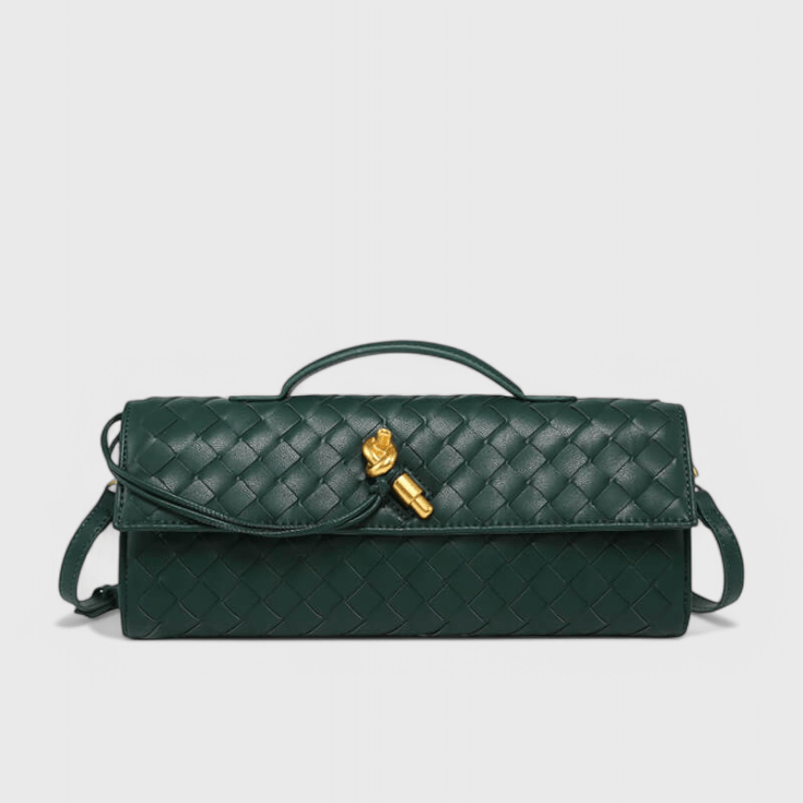 Bodil | Stilren Veske er en sofistikeret luksushåndtaske der tilføjer moderne elegance til din hverdag. Med sin slanke baguette-siluet og sculpturale gyldne knude vidner den om omhyggeligt håndværk og materialer af højeste kvalitet.